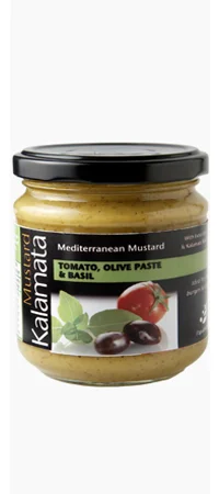 Mild Mediterranean mustard which combines favorite flavors including the No 1 Papadimitriou Kalamata Balsamic Vinegar, extra virgin olive oil, honey, tomato, olive paste and basil.